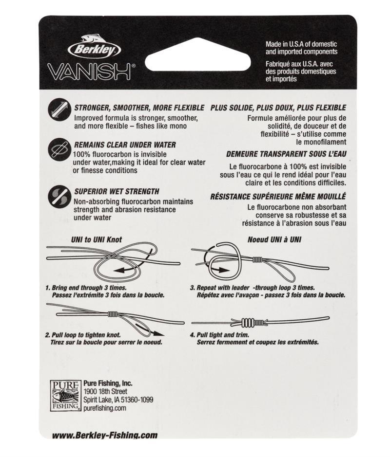 Easy-casting Berkley Vanish has become a popular mainline fluorocarbon in the U.S. and Canada. We have been continuously improving the Vanish formula since it was introduced 15 years ago, to ensure your satisfaction. One of the great values in 100% fluorocarbon line!