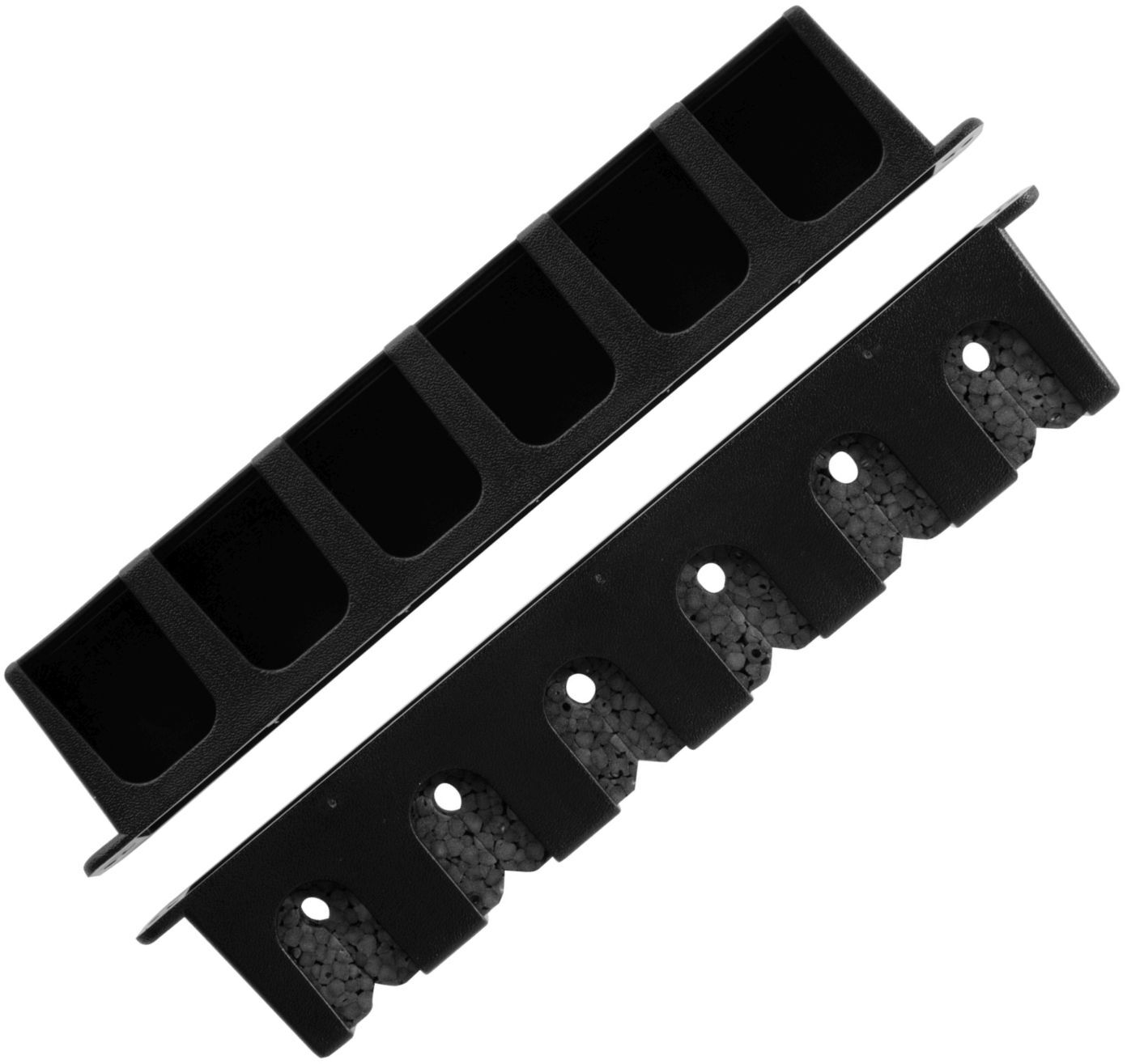 Use enclosed screws to attach to wood, metal, fiberglass or plastic. Use suitable wall anchor when applying to sheetrock or wallboard. Spacing between mounts vary depending on gear stored - recommended spacing between mounts is approximately 42".