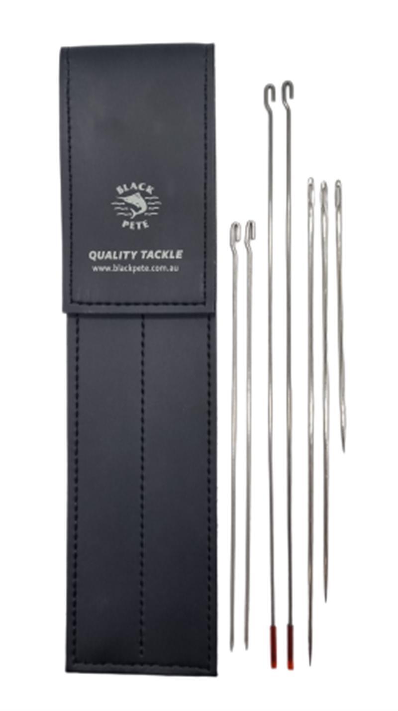 Outside of the Cairns heavy tackle marlin fishery, rigging dead baits to skip or swim is largely a forgotten art, but bait rigging is gradually coming back into vogue as southern anglers realize just how useful a skill it can be when switch-baiting striped and mid-range black marlin. Having the right stitching needles is crucial to getting the various bait fish to skip or swim correctly and for extended periods of time, as too big a needle will make an excessively large hole. This will lead to the rigging working loose and the bait quickly 'washing out'. Black Pete's Bait Rigging Needles are made of stainless steel and come in three useful sizes to suit a variety of different bait rigging scenarios. The ten-centimeter model is ideal for mullet, garfish, slimy mackerel, and the like, the 15-centimeter needle will handle scad, queenfish and small tuna, and the jumbo 21-centimeter version is perfect for large tuna, scaly mackerel, and rainbow runners. The needle eyelets are flattened and slim in profile, so as not to make too big a hole in the bait, and the points are nice and sharp, so they easily penetrate gristle and bone. The six-needle set is supplied in a stylish leather pouch with a hook grip closure.