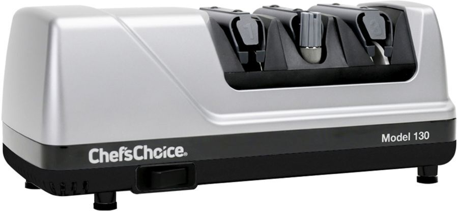 The 130 professional 3-stage electric knife sharpener is the ideal solution for 20-degree class knives. Using 100 percent diamonds, the hardest natural substance on earth, our patented abrasives sharpen edges faster and easier. This sharpener improves cutting performance by creating 2 distinct facets set at different angles to form a longer lasting, arch-shaped edge. The first stage sharpens straight-edge knives using medium diamond abrasives. The second and third stages create different finishes based on the cutting task. Use stage two for a micro serrated finish or use stage three for a polished finish. Precision angle guides ensure accurate sharpening throughout the entire blade length and eliminate any guesswork. This unit is designed to work with both straight-edge and serrated knives.