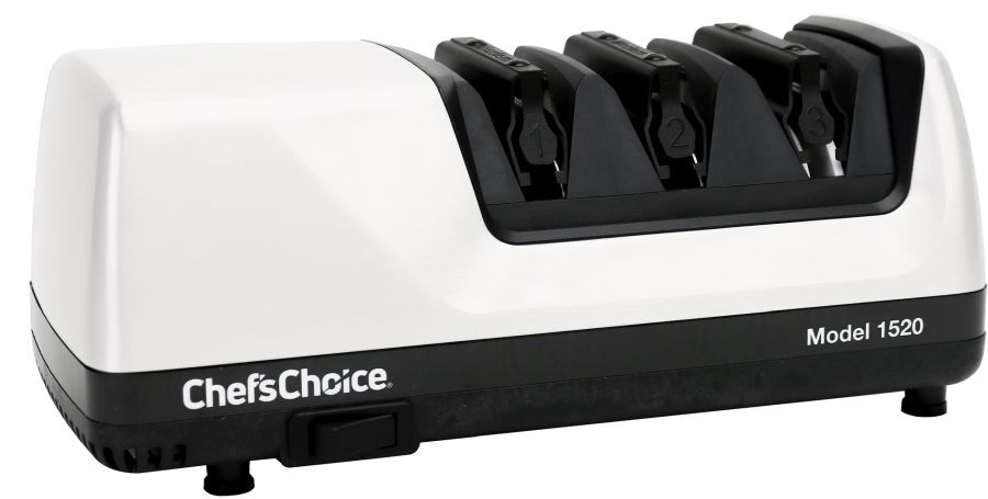 The Chef’s Choice 1520 AngleSelect professional electric knife sharpener is the ideal solution for both 15 and 20-degree class knives. Using 100 percent diamonds, the hardest natural substance on earth, our patented abrasives sharpen edges faster and easier. This sharpener improves cutting performance by creating 2 distinct facets set at different angles that form a sharp, longer lasting, arch-sharped edge. The first stage sharpens 15-degree straight edge knives, while the second stage sharpens 20-degree straight edge knives. In the final stage, patented stropping disks create an unparalleled polished finish to both 15-degree & 20-degree knives. Precision angle guides ensure accurate sharpening throughout the entire blade length and eliminate any guesswork. This unit is designed to work with both straight-edge and serrated knives.