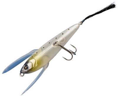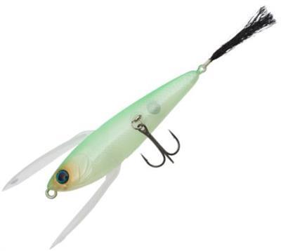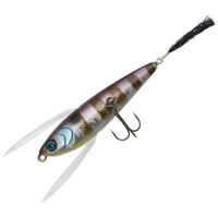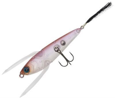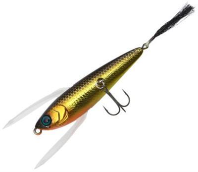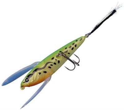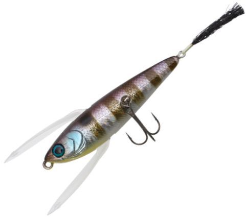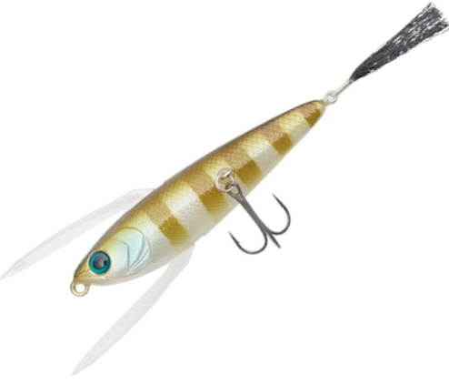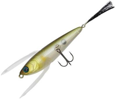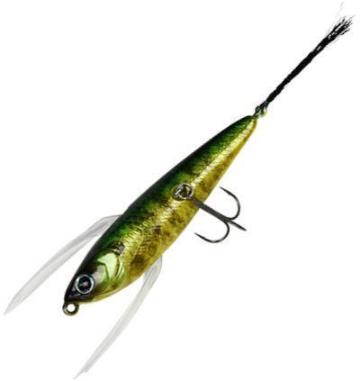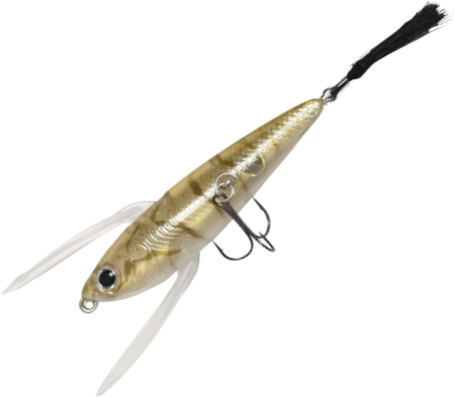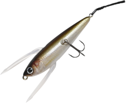 A new concept top water lure, the Dstyle Reserve. This is a small lure imitating baitfish on topwater that induces bass into striking with its erratic and slow shaking action. Featuring a unique translucent wing system that slows the forward movement of the retrieve and creates the illusion of a struggling baitfish on the surface, the wings are also equipped with 3D eyes to mimic several baitfish busting and tangling on the surface. The Dstyle Reserve Topwater can be retrieved several ways, a slow twitch-and-stop retrieve mimics a single wounded baitfish on the surface, while a steady retrieve mimics a small school trying to evade predators.
