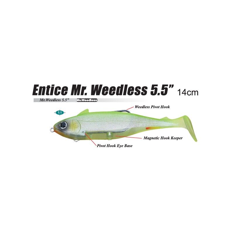 The Entice Mr. Weedless Lure 5 1/2 Inch is your ultimate solution for tackling challenging fishing environments. Designed with precision, this weedless paddle tail swimbait features a magnetic hook keeper that secures the hinged pivot hook snugly within the body, ensuring seamless retrieves through dense vegetation or snaggy structures. On the strike, the hook is perfectly exposed for a secure catch, making it a game-changer for estuary and freshwater fishing.