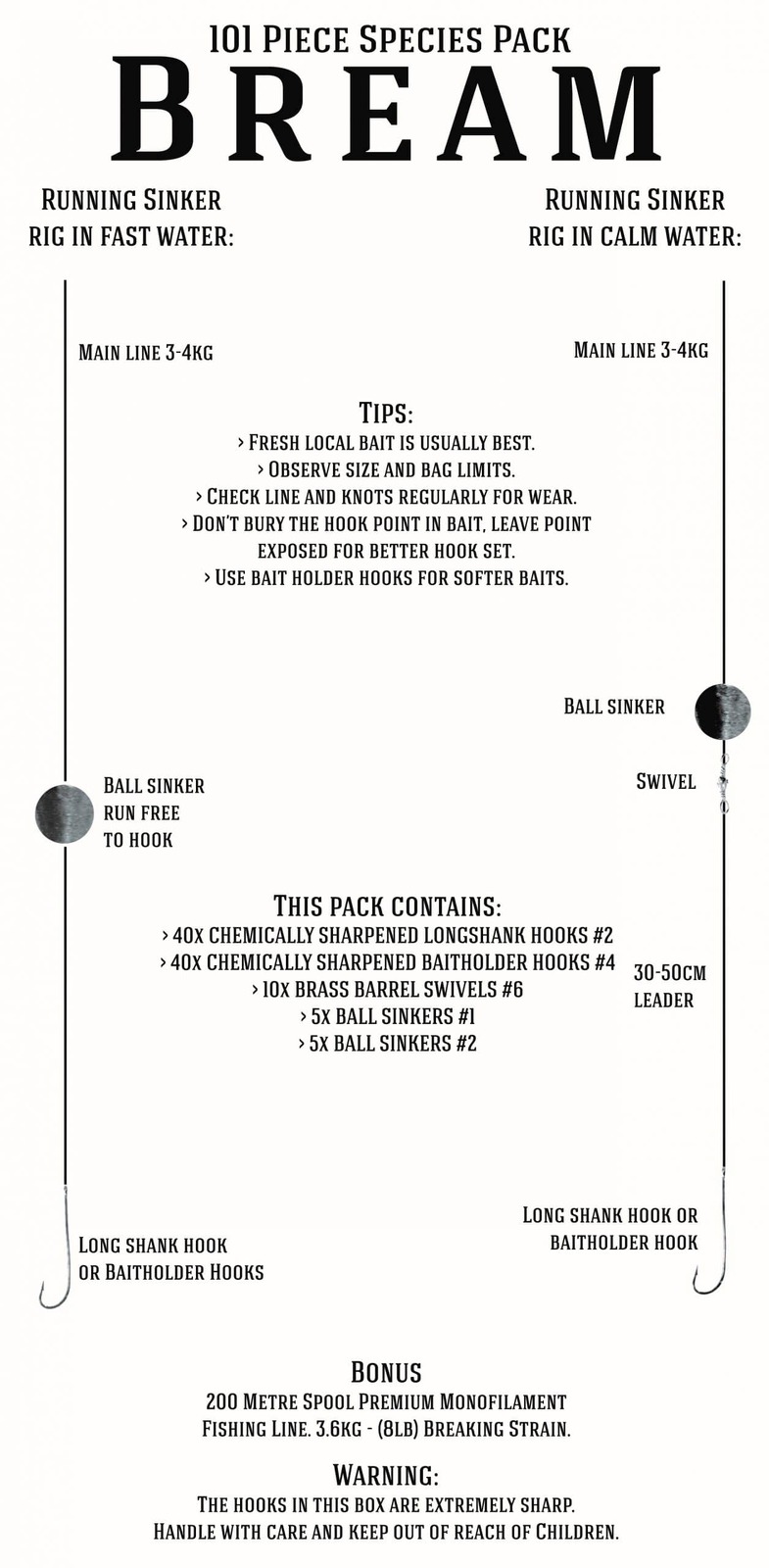 The Bream pack has 100 pieces of tackle including chemically sharpened long shank and baitholder hooks as well as swivels and ball sinkers packed in a tackle box. Also included is the bonus spool of camo brown fishing line to suit all water conditions.