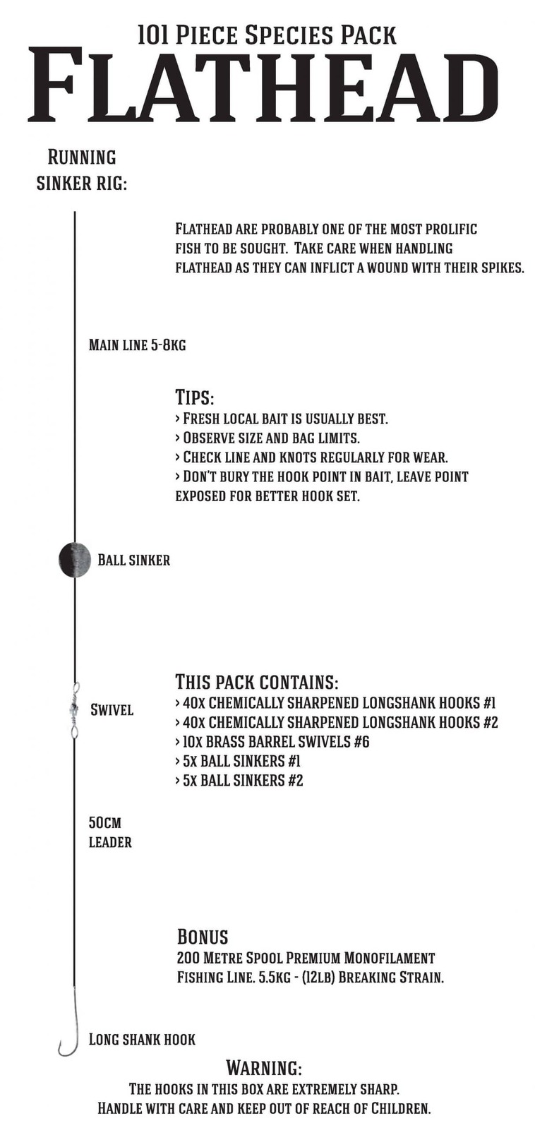 Flathead are one of the most common saltwater fish species fished for. This pack all the necessary tackle including Red Chemically sharpened long shank hooks, swivels and sinkers packed in a sturdy tackle box. just add bait. Bonus line inc.