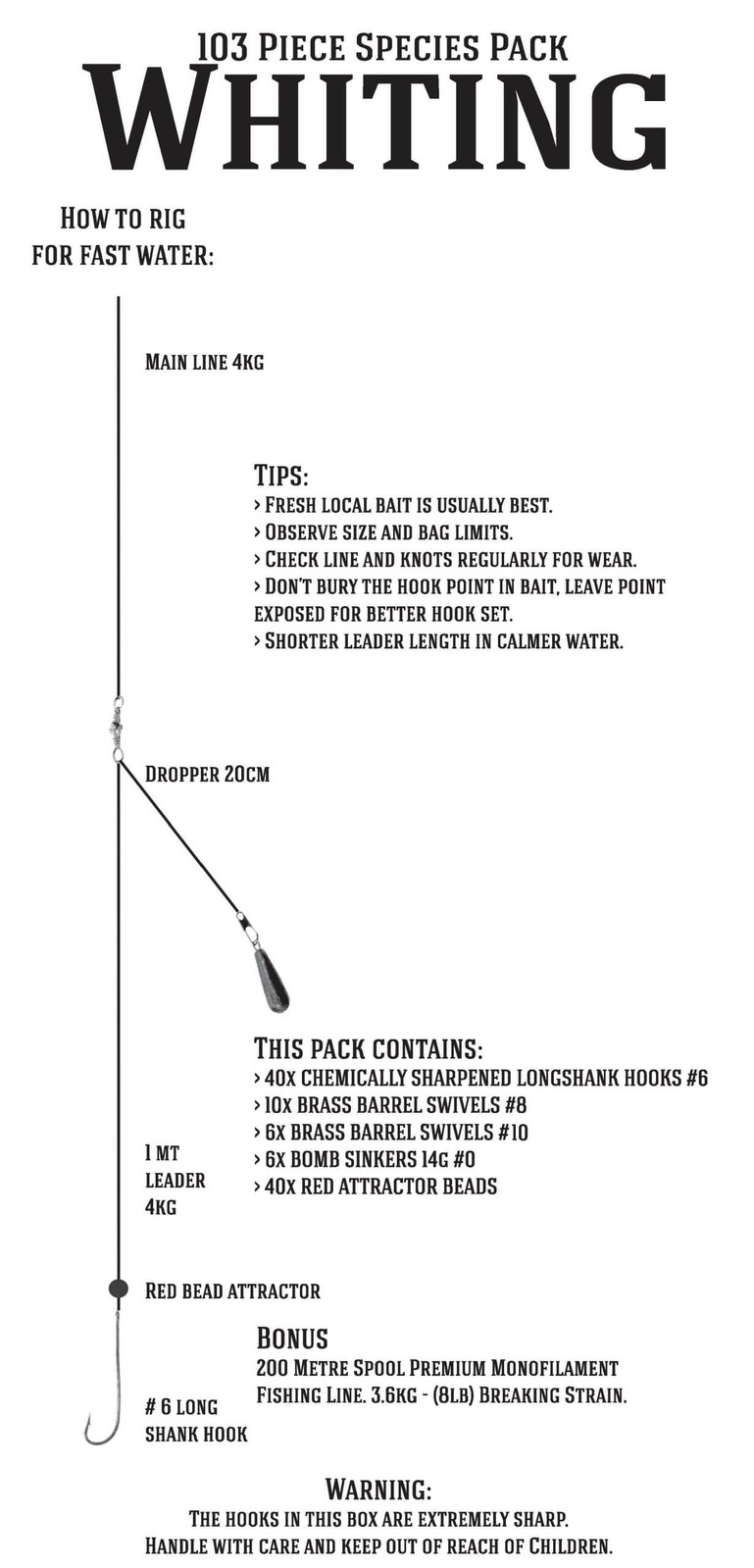 The Whiting species pack contains red chemically sharpened long shank hooks, attractor beads, swivels and bomb sinkers packed in a sturdy tackle box. All the terminal tackle you need to target King George, Sand and other Whiting species. Bonus line included.