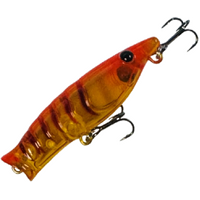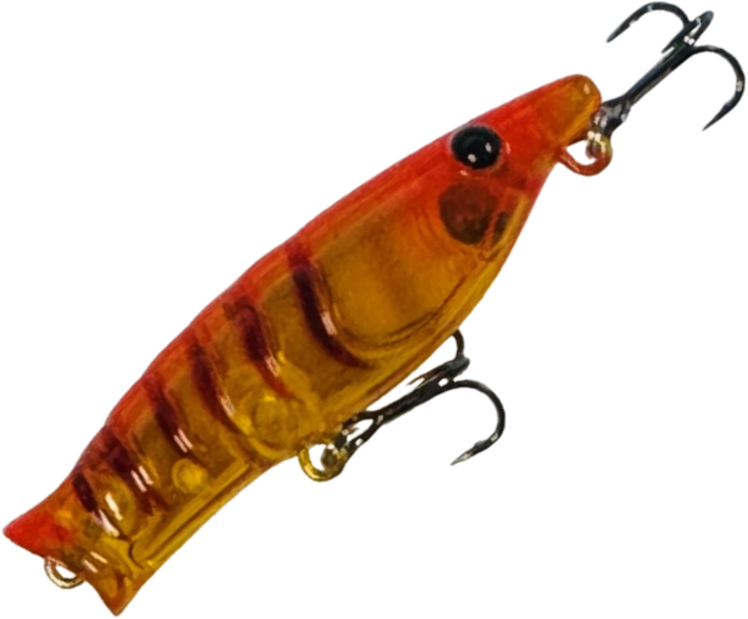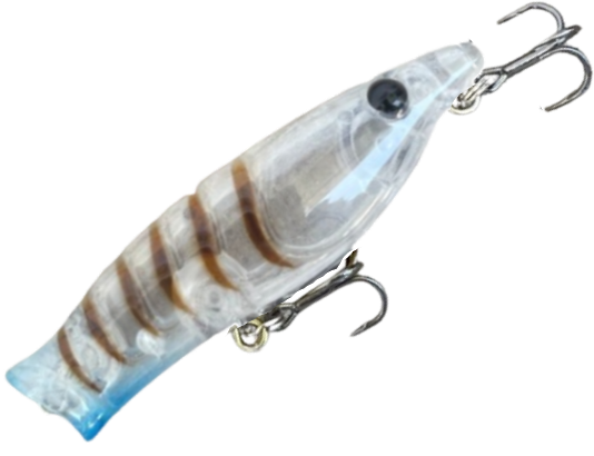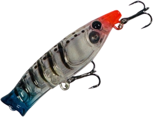Combining the lifelike profile of a resting prawn with the surface-churning power of a cup-faced popper, this lure floats head-down when stationary, offering a vulnerable appearance that tempts surface-feeding fish. The cup face is designed to displace water with each twitch or pop, generating noise and vibration that "calls up" fish from below—especially effective in low light, early morning, or calm-water conditions.