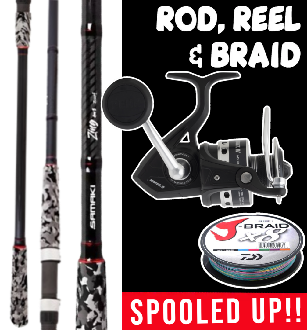 Take your surf fishing game to the next level with the Heavy Hitter Surf Rod Reel Combo — a fully loaded, high-performance setup that’s ready to fish straight off the shelf. This powerful combo brings together the strength of the Samaki Zing Gen 3 SZG3-1202SH Spin Rod, the durability of the Penn Pursuit IV 6000 Spin Reel, and the cast-ready advantage of 300 yards of pre-spooled Daiwa J-Braid X8 braid (your choice of 20lb, 30lb, 40lb, or 50lb).