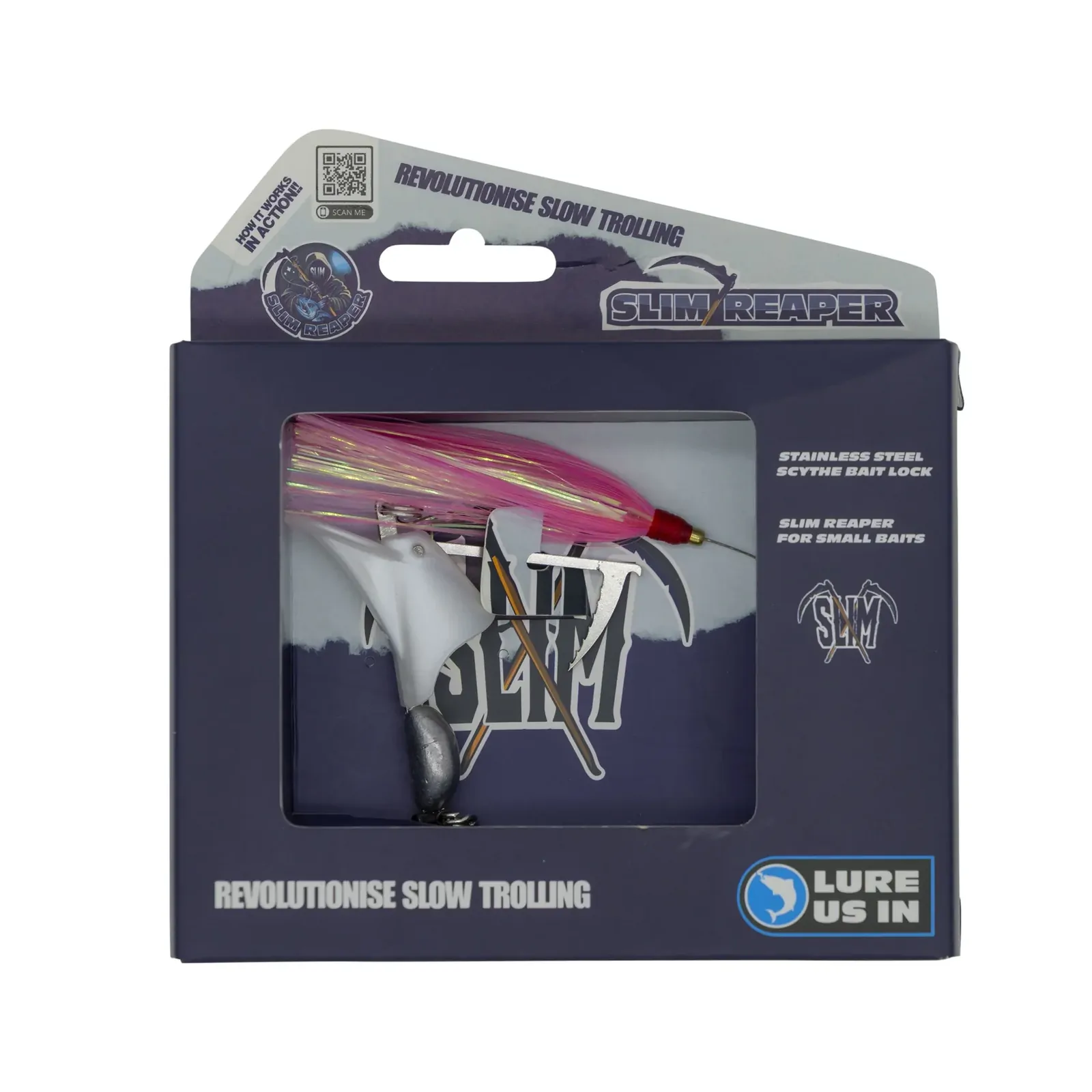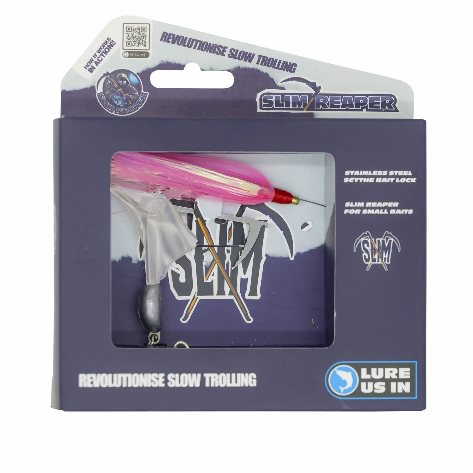 A stainless steel scythe bait lock makes re-baiting fast, easy, and secure — meaning more time fishing and less time rigging. Whether you’re targeting tuna, mackerel, mahi mahi, or other fast pelagics, Lure Us In The Slim Reaper outperforms the competition with better swimming action, easier handling, and superior durability.