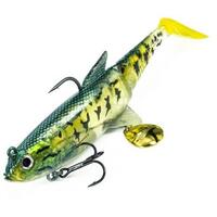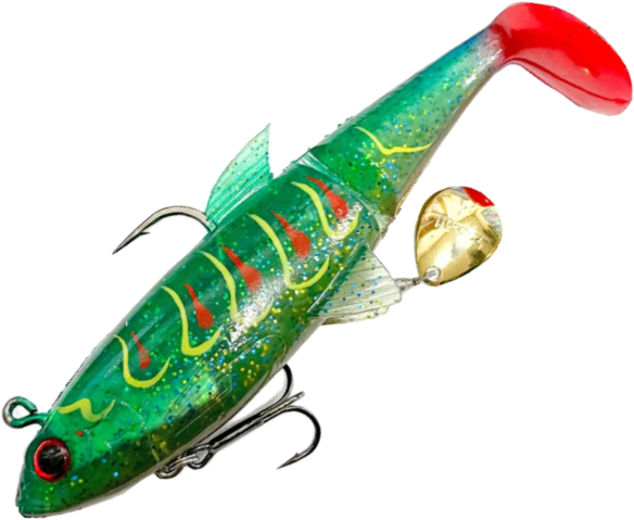 It is a soft swimbait, jointed for the great predators that live in deeper waters where jerk baits and spinnerbaits don’t arrive and where a traditional soft bait struggle to be attractive. The high frequency vibrations, produced by the blade inserted under the belly, recall even the fishes that swim far from this lure , even in murky waters. The position of the ring in the head allows it to be used effectively also vertically. It’s made with a new blend that makes it resisten and durable.