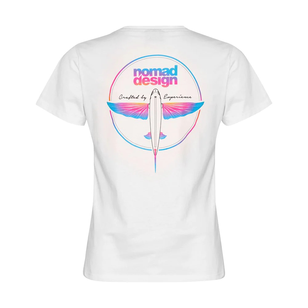 Elevate your casual wear with the Nomad Women's T-Shirt in Flyer White. Made from luxurious midweight 100% combed cotton, this short-sleeve tee offers a relaxed fit with a crew neck. Pre-shrunk for durability, it's perfect for everyday wear. The design is enhanced by soft hand-feel prints and a stylish Nomad neck tape.