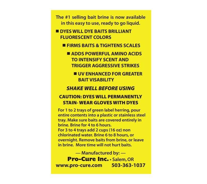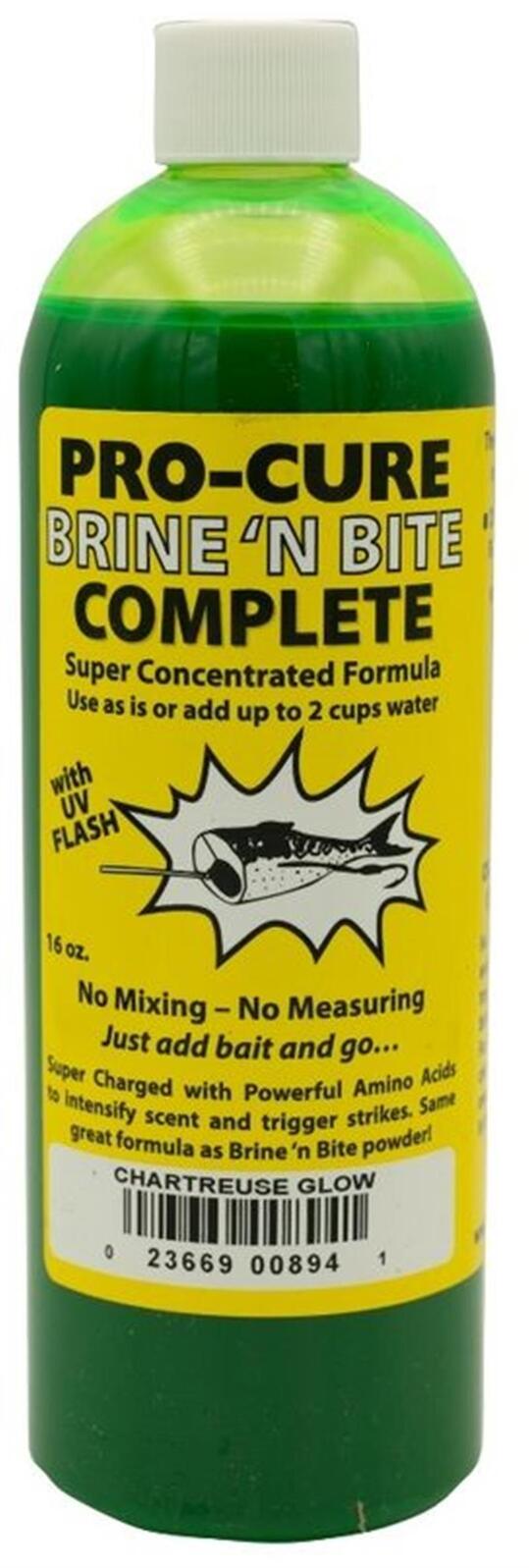 Available in Chartreuse Glow, with perfect amounts of dyes to give you brilliant, fluorescent-coloured baits, or Natural Shine, with Bait Brite, designed to enhance the natural shine and glow of your baits, both with UV added. Brine 'N Bite Complete liquid also contains Pro-Cure's proprietary blend of amino acids to attract fish and trigger aggressive strikes.
