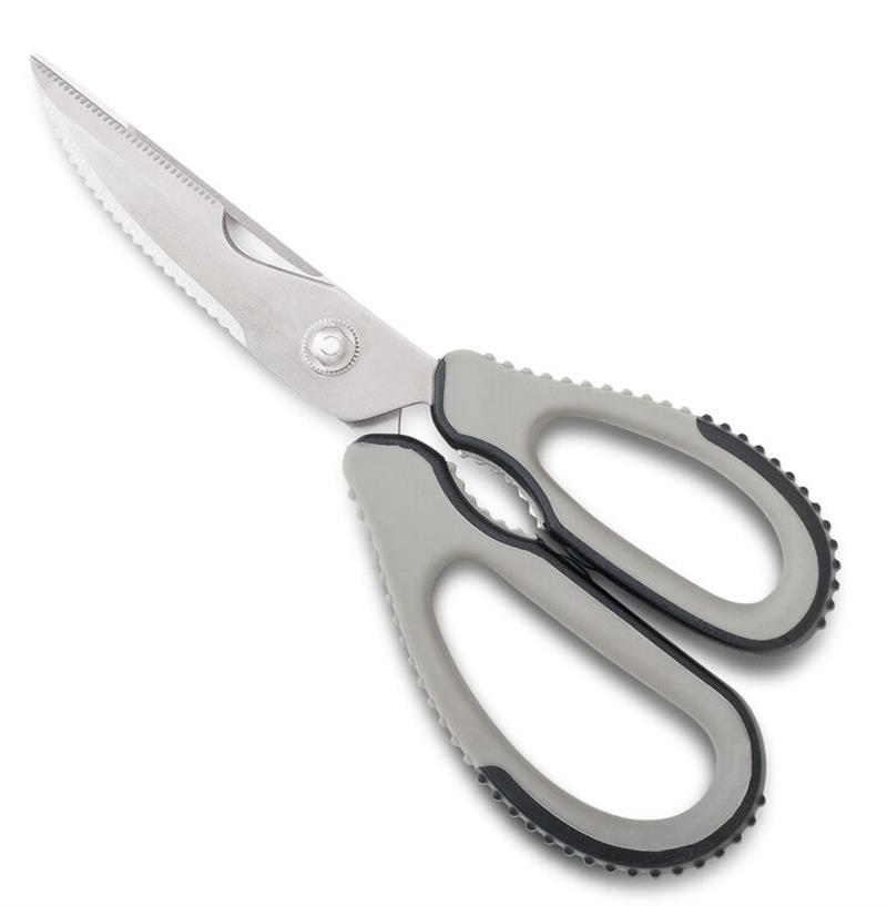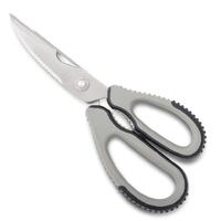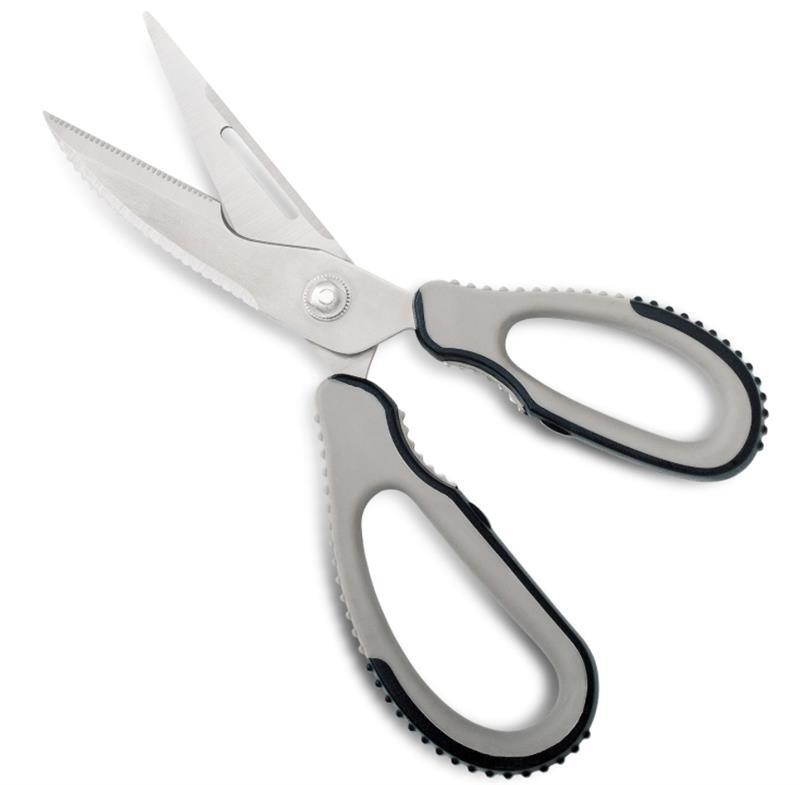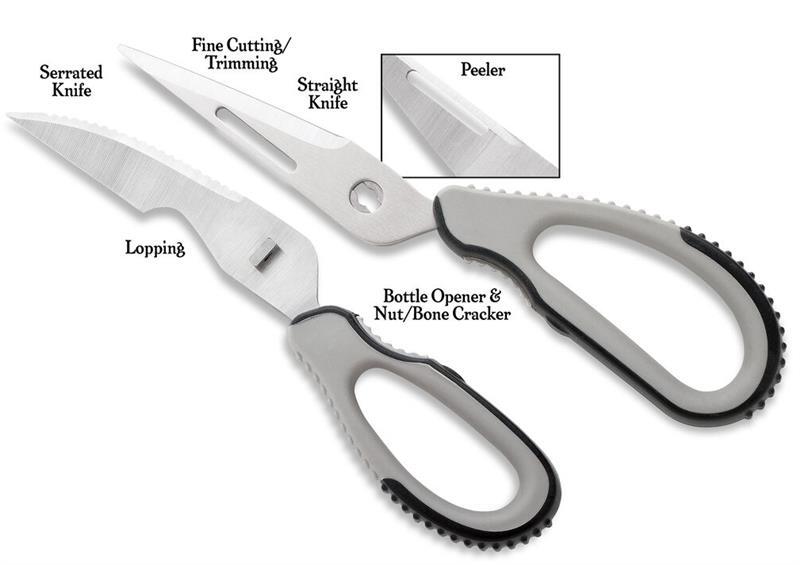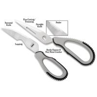 One tool for a multitude of cutting tasks. Shears are great for heavy leverage lopping to fine detail trimming. Includes straight knife and serrated knife/fish scaler, bottle opener/bone cracker and vegetable peeler. 2-piece design allows for easy cleaning. Oversize grip is ideal size for large hands or working with gloves on.