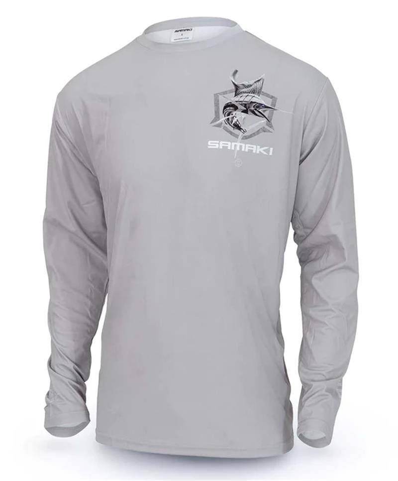 The striking Sailfish in all its glory stands out from the crowd as the feature species in the new performance wear, a soft silver colour pallet complimented by a metallic sailfish has made this shirt a standout on the water or at your local.