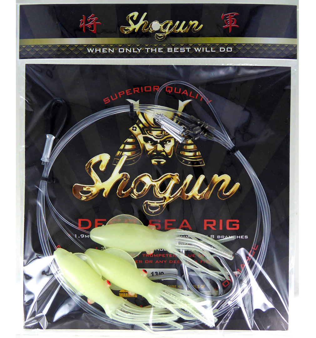 The Shogun Deep Sea Rig is the go to rig when chasing all deep blue species. Fitted with 140lb main line and 13/0 shogun circle hooks, along with ultra bright glow squids, this rig is a must for all tackle boxes.