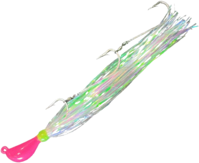Designed for serious saltwater anglers, this rig features a banana-shaped UV head that adds a lifelike, rolling action to dead or strip baits, imitating injured prey. The bright lumo pink head, UV-active whipping, and pearlescent mylar flash enhance underwater visibility, making it a standout choice in clear or lightly stained water.