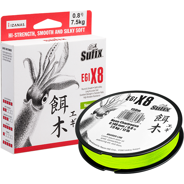 The Sufix Egi X8 Braid 150m Neon Chartreuse is the ultimate choice for squid fishing aficionados. Utilizing advanced 8-carrier braiding technology, this line offers unparalleled strength and sensitivity, allowing you to detect even the subtlest movements from following squids. Its fine diameter and smooth texture make it easy for your squid jig to sink quickly, cutting through the water with minimal resistance. Perfect for long casts, this 150m braided line is designed to withstand abrasions, ensuring that your reel is spooled with nothing but the best.