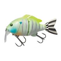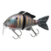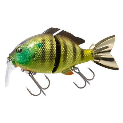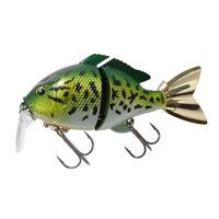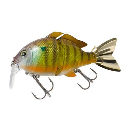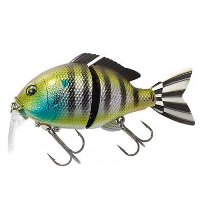 This bluegill-look jointed minnow has a thick profile and is very buoyant. Well-balanced combination of a noisy bait and a waking crank bait. Makes a very attractive wash following the bait. The jointed body and the metal tail parts makes attractive sounds.