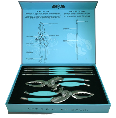 The most innovative crab and lobster tools on the market. Everything you need to open and enjoy fresh, hard-shelled seafood without the mess. Also, for every product sold, we will replant new oyster beds to help clean our coastal waters. Let’s Put ‘Em Back.