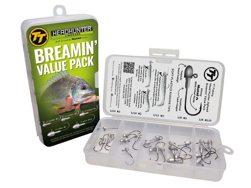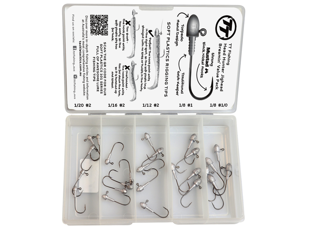 The TT Lures Head Hunter Breamin' Value Pack is an essential collection for anglers targeting bream with soft plastics. Designed with Mustad® chemically sharpened hooks, these jigheads offer both strength and precision, ensuring better hook penetration and durability. This value pack contains the most popular hook and weight combinations, making it perfect for anglers looking for versatility without sacrificing quality. Whether you're fishing in rivers, estuaries, or shallow bays, this pack provides the ideal jighead sizes to secure your soft plastics and increase your chances of success. Organized in a durable, clear plastic tackle tray, it's a convenient and practical addition to any tackle box.