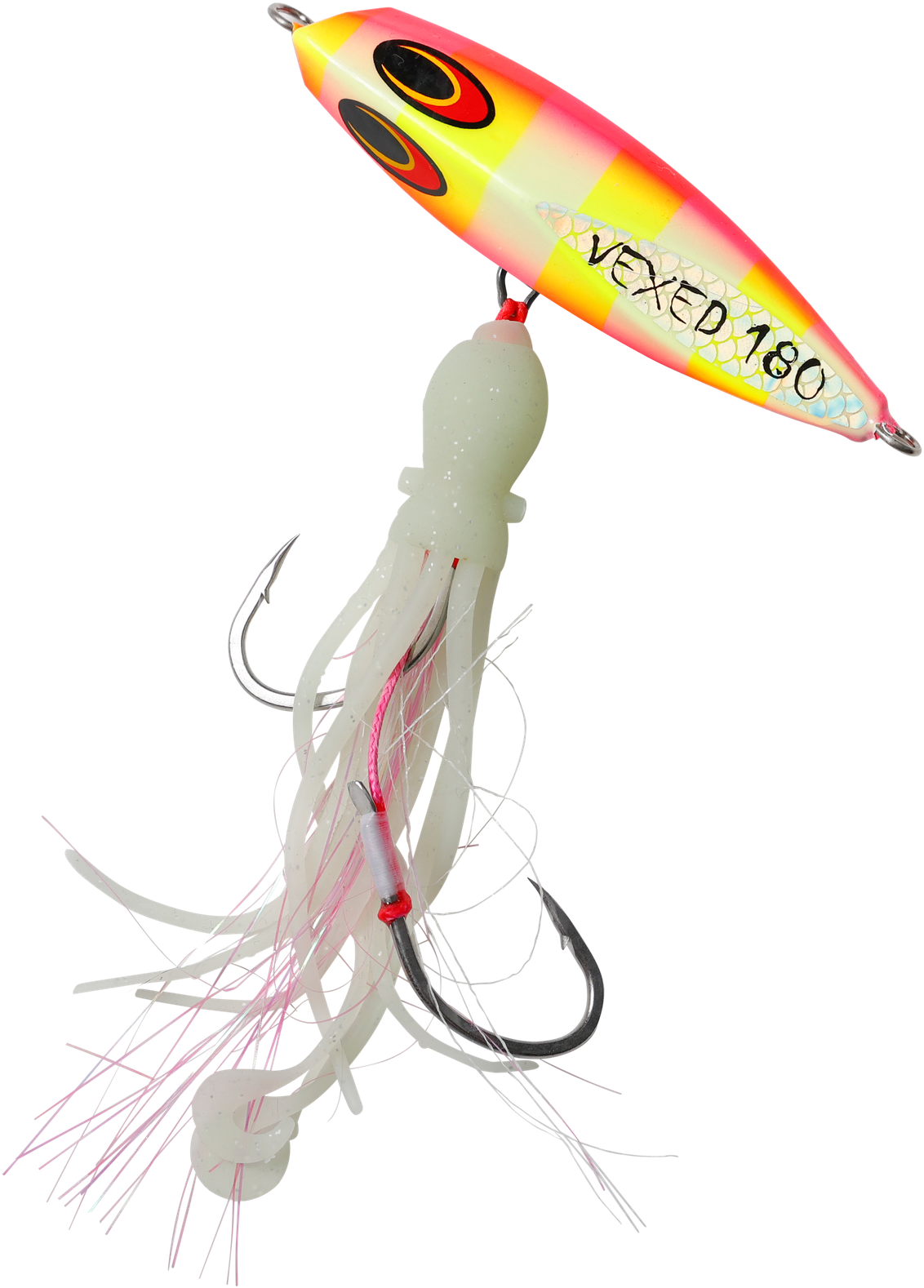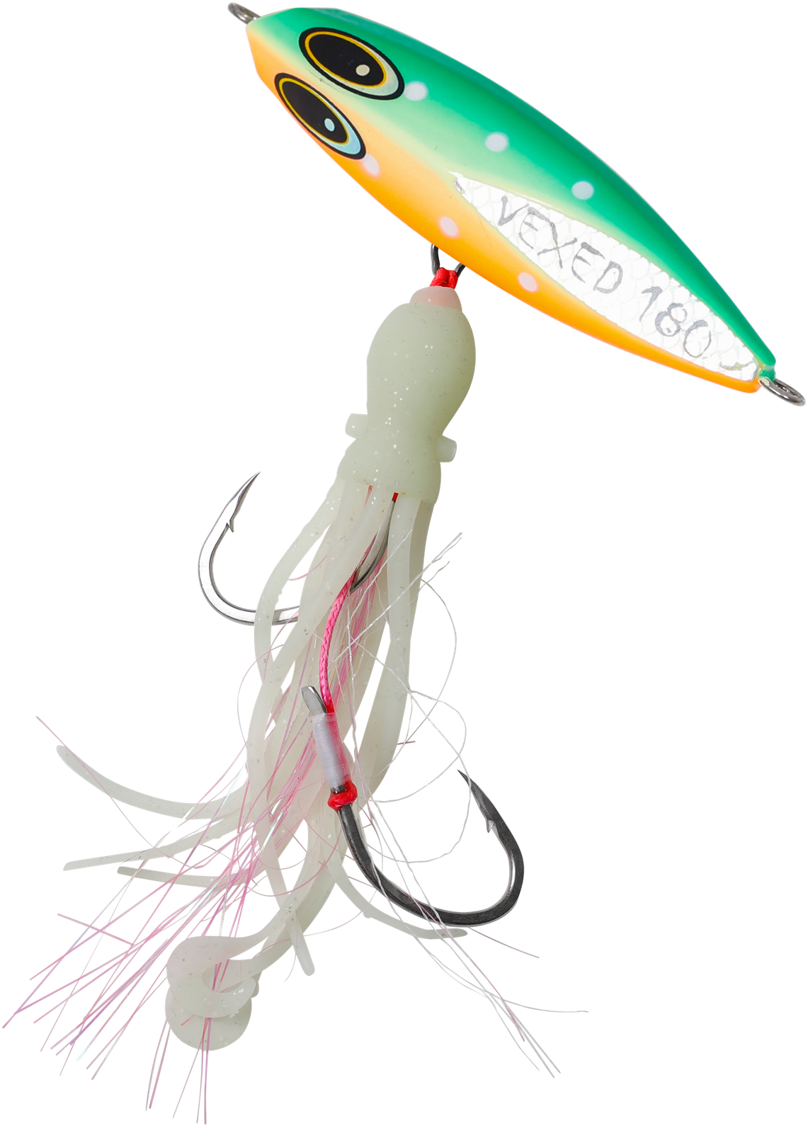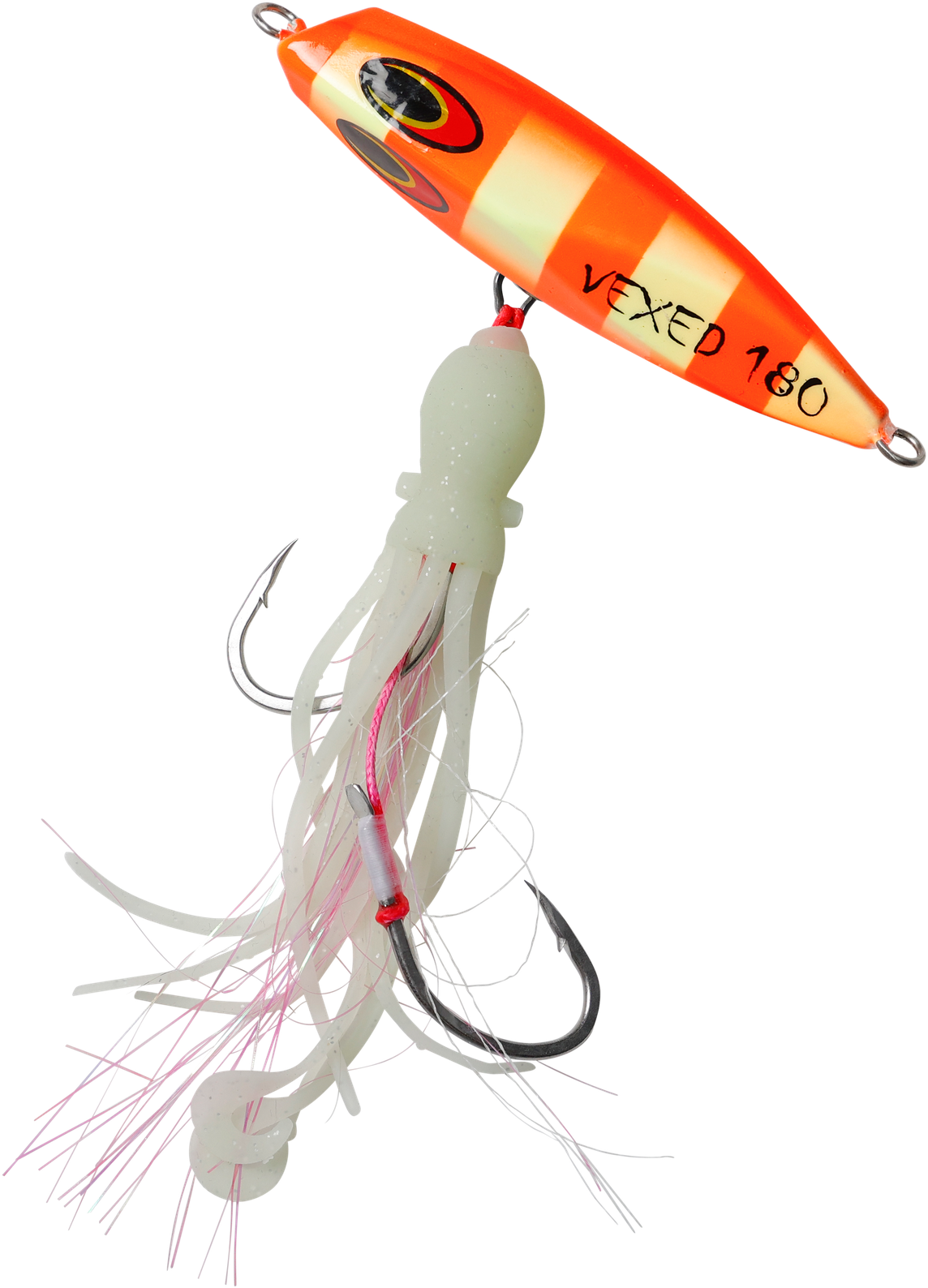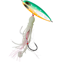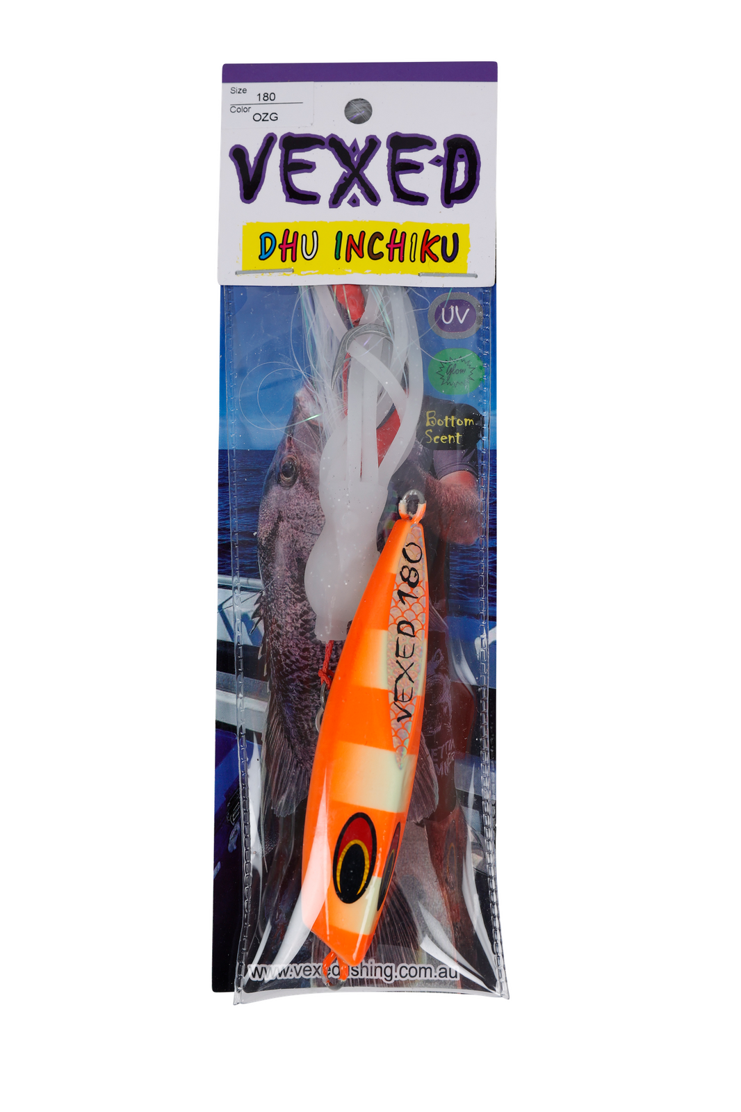 Originating from the techniques of Japanese snapper fishermen, the Inchiku jig's traditional design allowed anglers to manage multiple rods simultaneously. Historically, these jigs weighed between 40g-100g and featured a simplistic look with tiny size 4 hooks. Now, meet the VEXED DHU INCHIKU. Reimagined for Australian fishing conditions, we've enhanced its weight for quicker and deeper submersion. The jig now boasts larger, ultra-sharp hooks to cater to Australia's more robust fish. We've also replaced the conventional PVC octopus assist with our resilient, fragrant, ultra-flexible, and high-intensity UV/Glow Flashy Occy Head Assist. Coupled with our tried-and-true Vexed Bottom Meat colour patterns, this is the finest Inchiku ever crafted. Target a variety of species including Dhu Fish, Snapper, Groper, Coral Trout, Cod, Red Emperor, and Cobra King Fish with the DHU INCHIKU.
