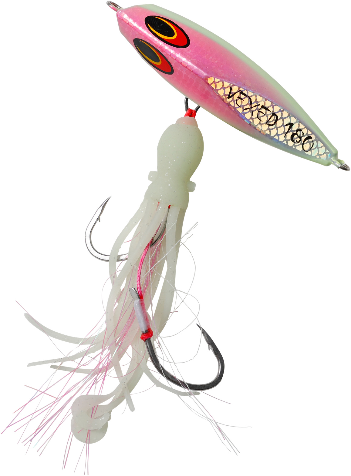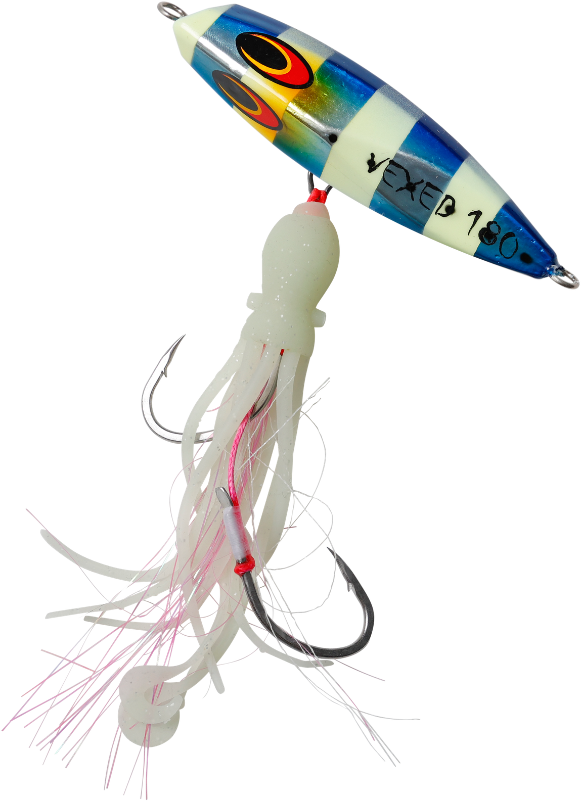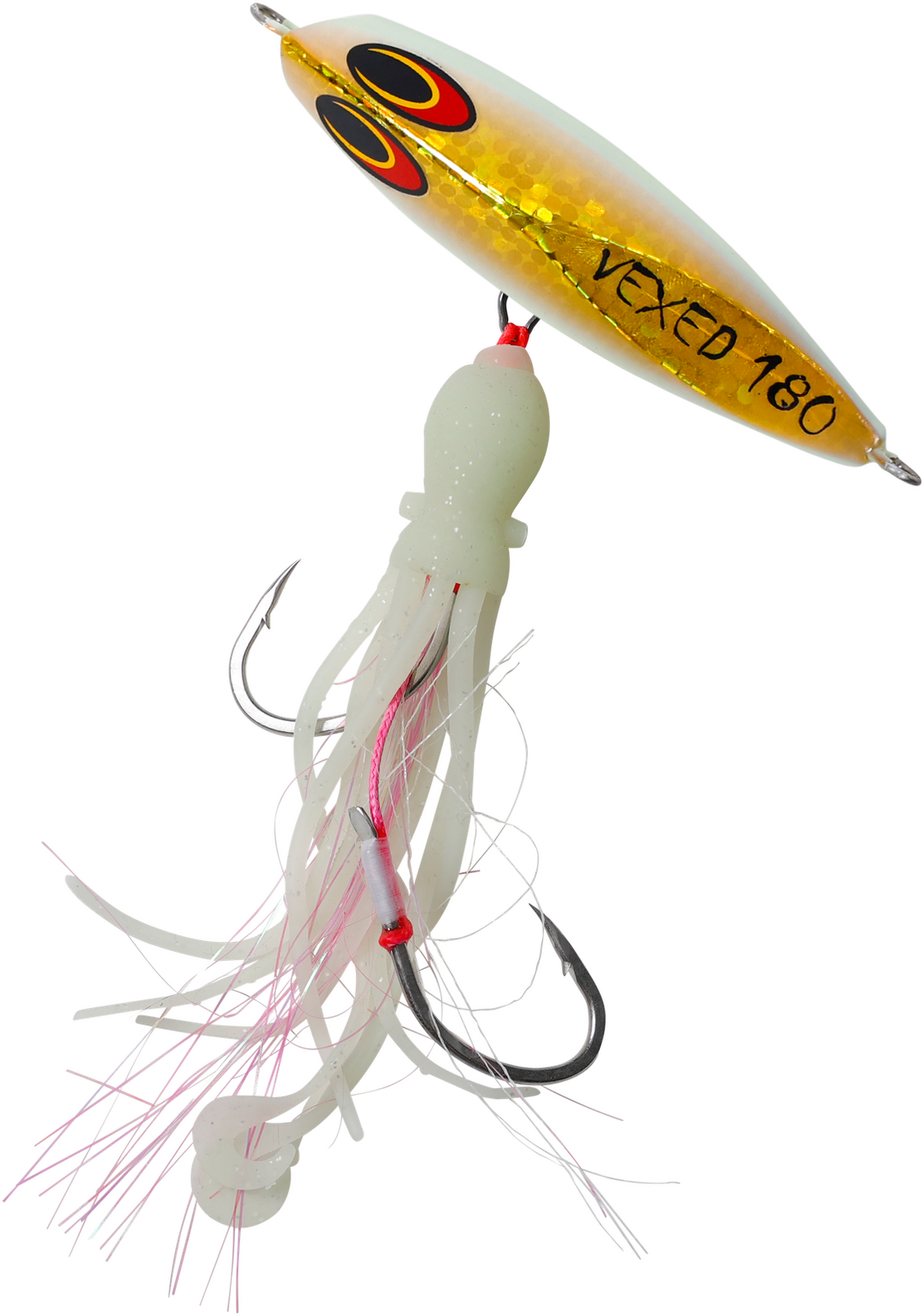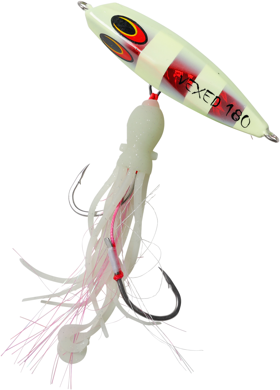 Originating from the techniques of Japanese snapper fishermen, the Inchiku jig's traditional design allowed anglers to manage multiple rods simultaneously. Historically, these jigs weighed between 40g-100g and featured a simplistic look with tiny size 4 hooks. Now, meet the VEXED DHU INCHIKU. Reimagined for Australian fishing conditions, we've enhanced its weight for quicker and deeper submersion. The jig now boasts larger, ultra-sharp hooks to cater to Australia's more robust fish. We've also replaced the conventional PVC octopus assist with our resilient, fragrant, ultra-flexible, and high-intensity UV/Glow Flashy Occy Head Assist. Coupled with our tried-and-true Vexed Bottom Meat colour patterns, this is the finest Inchiku ever crafted. Target a variety of species including Dhu Fish, Snapper, Groper, Coral Trout, Cod, Red Emperor, and Cobra King Fish with the DHU INCHIKU.