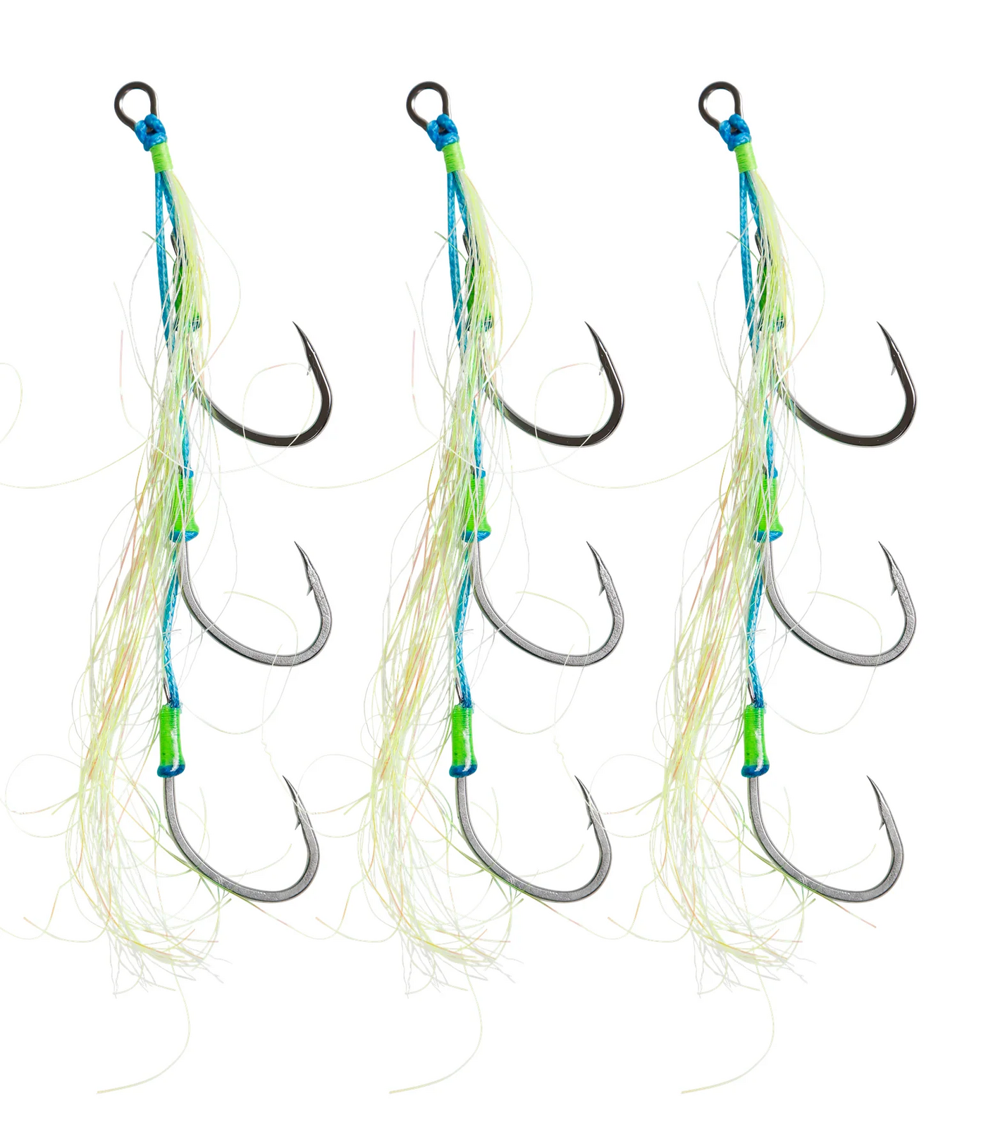 Equipped with three hooks, this design guarantees more successful catches than a single or double assist and enhances the bait presentation for a more appealing look. For unparalleled effectiveness, you can attach a strip of fresh fish, whole squid, octopus leg, or fresh pilchard, and fish it deep and slow.